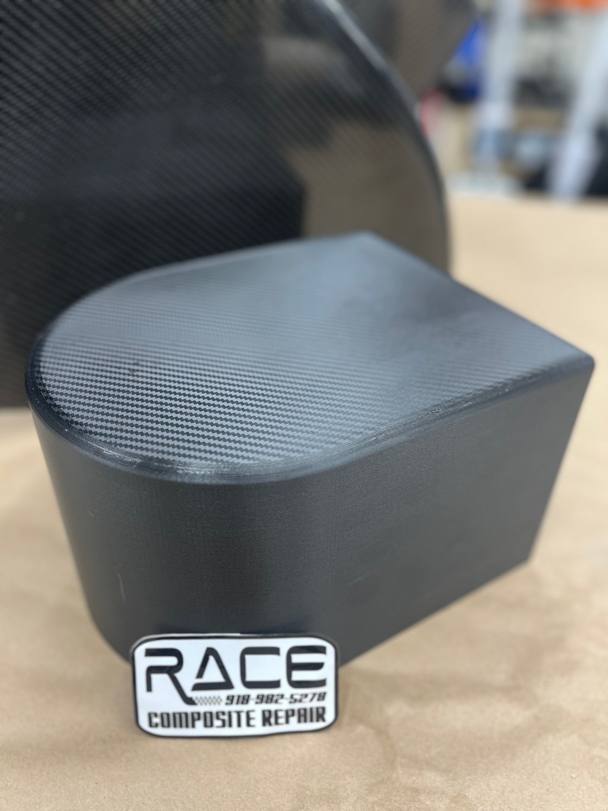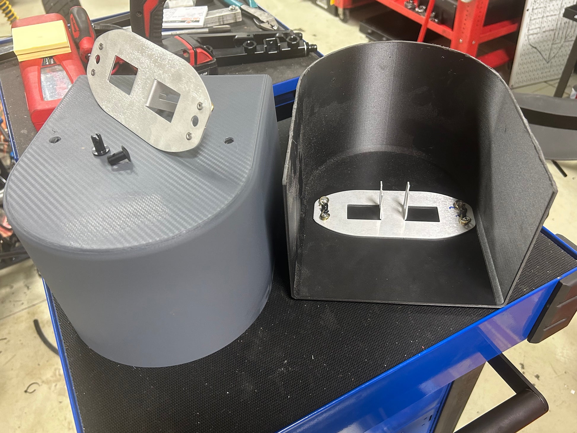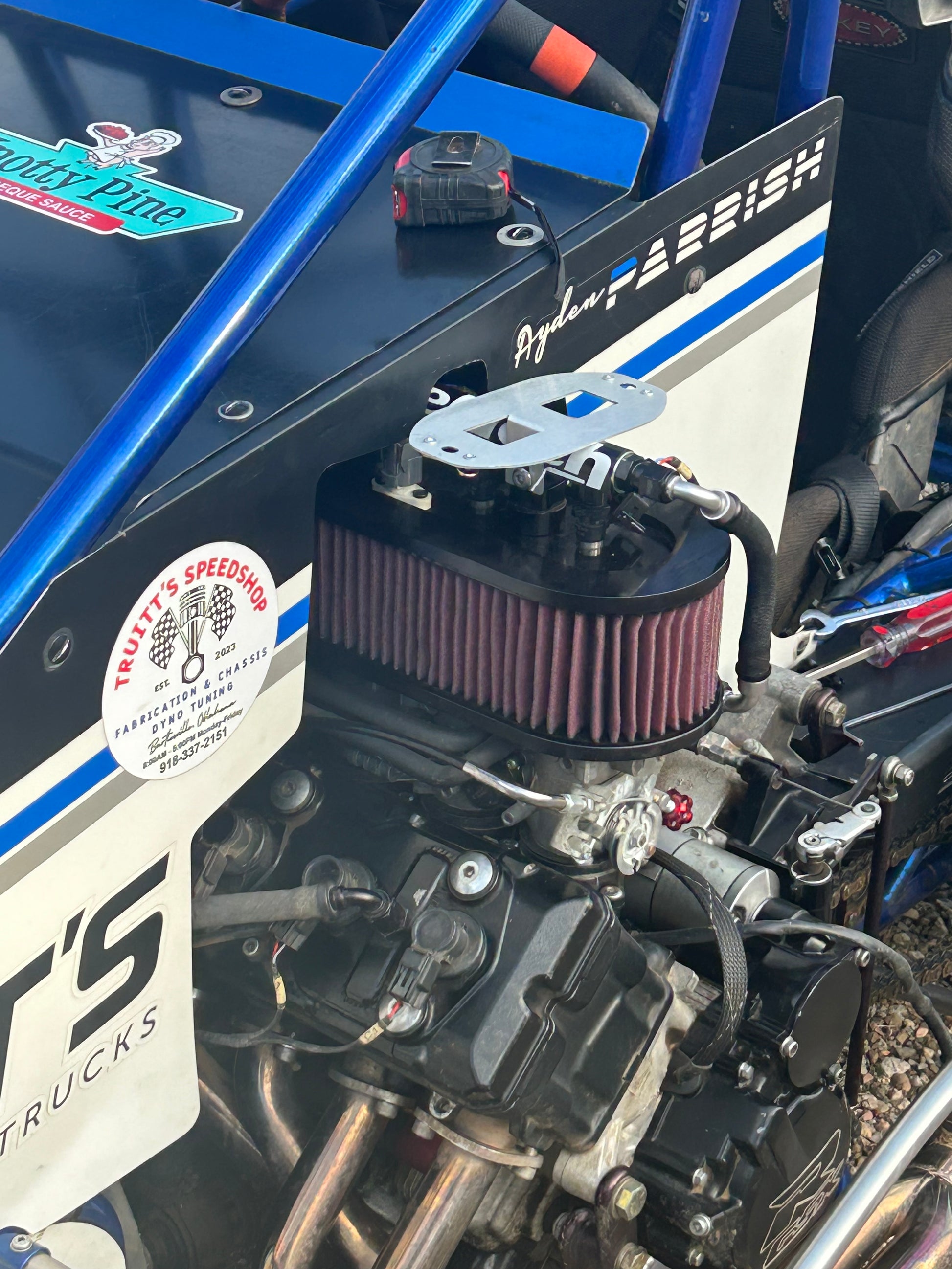 The custom-designed air filter from Syndicate Performance in Tulsa, OK cover is 3D printed using PETG CF, it serves as a protective shield for the air filter or fuel rail in 600cc micro sprint race cars, preventing rocks and debris from entering the filter during races.